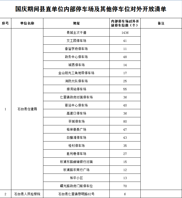 一、全县各级党政机关、企事业单位和社会团体,主动承担社会责任,按照“应开尽开,能开全开”的原则,在“两节”期间免费对外开放内部停车场,完善引导标识,配齐管理人手,尽力为八方来客和本地市民提供便捷、舒心的停车服务。