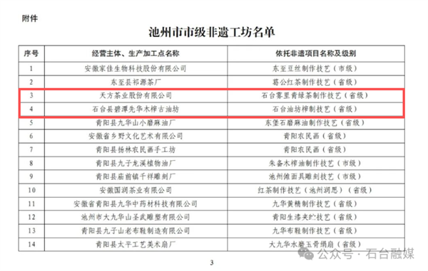 近日,石台县天方茶业股份有限公司、石台县碧潭先华木榨古油坊正式入选池州市市级非遗工坊名录。