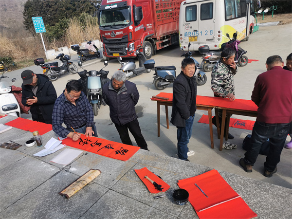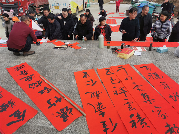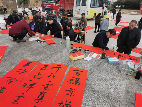 2月4日,石台县大演乡新唐村村部广场年味浓郁。县书法家协会的书法家们现场挥毫,一副副寓意吉祥的春联和“福”字跃然纸上,为即将到来的马年新春增添了浓厚的文化气息。